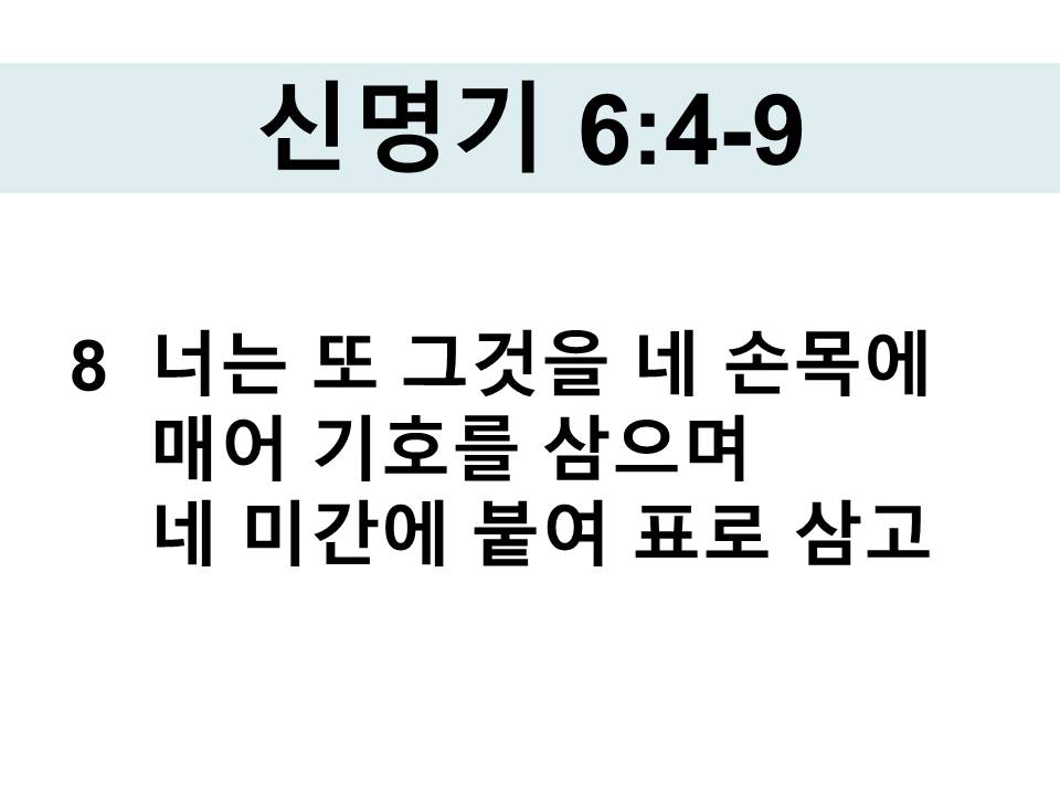 8 너는 또 그것을 네 손목에 매어 기호를 삼으며 네 미간에 붙여 표로 삼고
