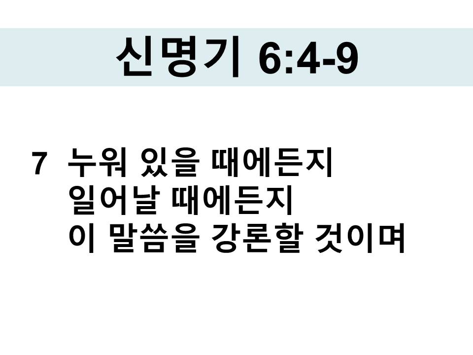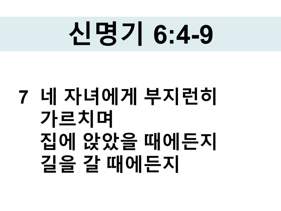7 네 자녀에게 부지런히 가르치며 집에 앉았을 때에든지 길을 갈 때에든지 누워 있을 때에든지 일어날 때에든지 이 말씀을 강론할 것이며