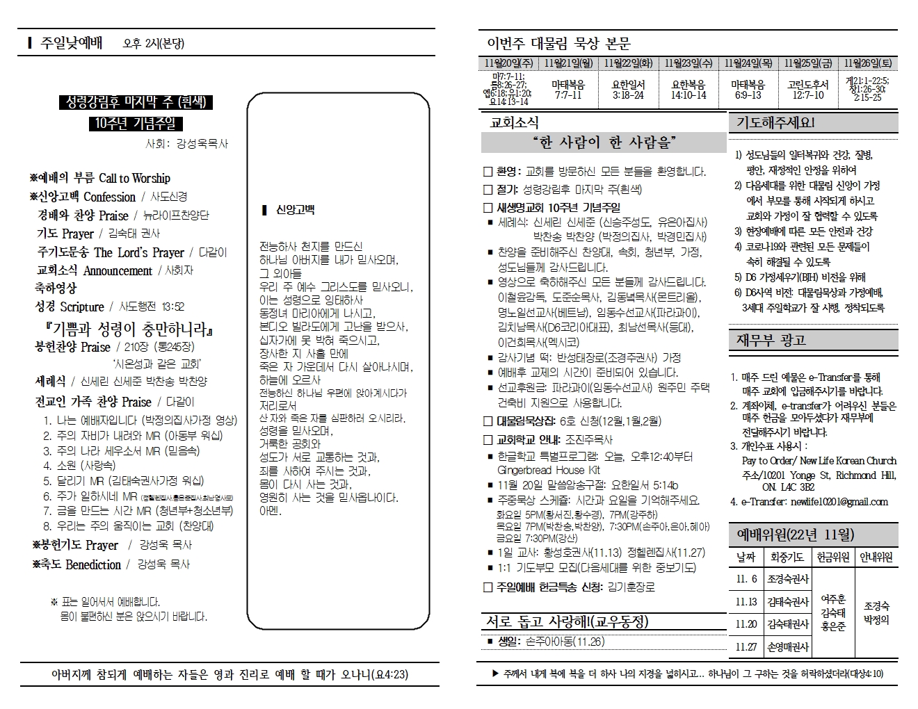 20221120 교회소식 및 주보 (새생명교회 10주년 기념주일)