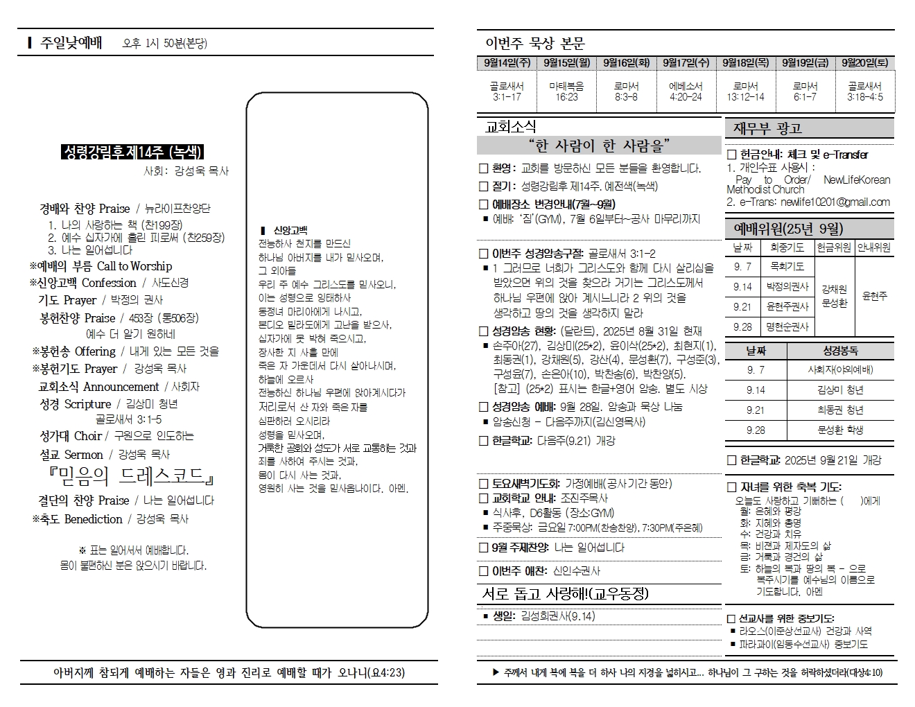 20250914 교회소식 및 주보
