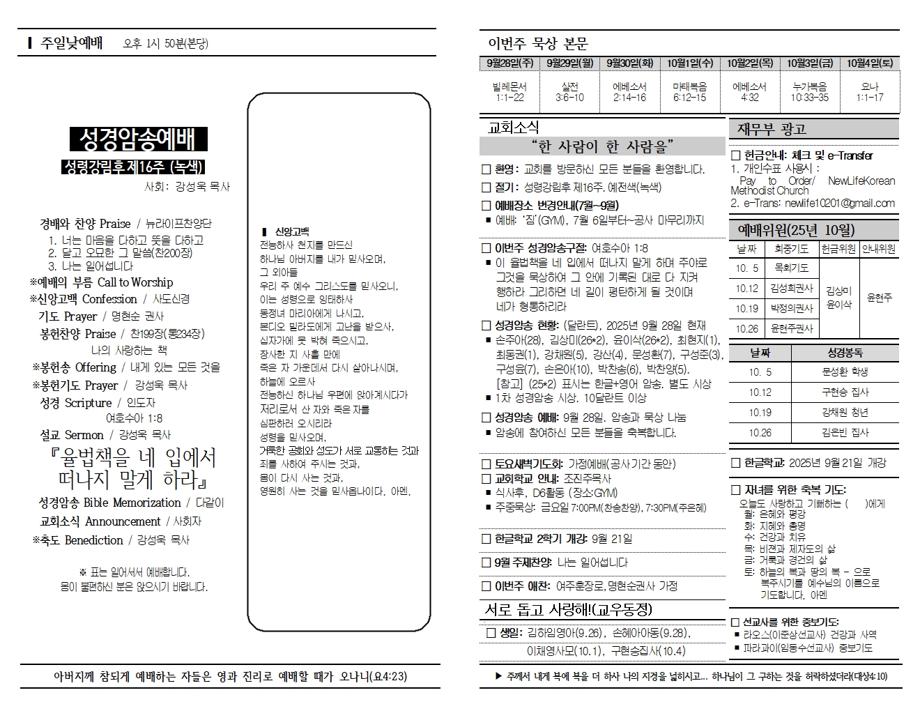 20250928 교회소식 및 주보