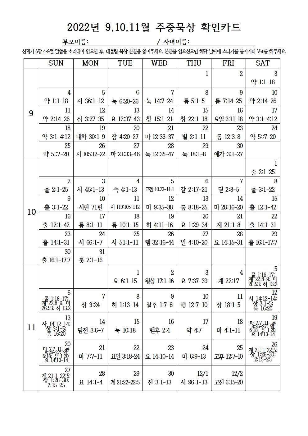 2022년 9,10,11월 주중묵상 확인카드